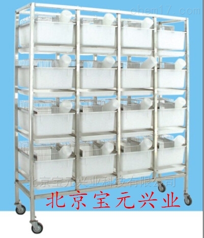 悬挂式大鼠笼架,可以放置16套大鼠笼,鼠笼采用托盘式设计,可以将白鼠的粪便等排泄物隔离出来,保持笼架的干净和方便清理。